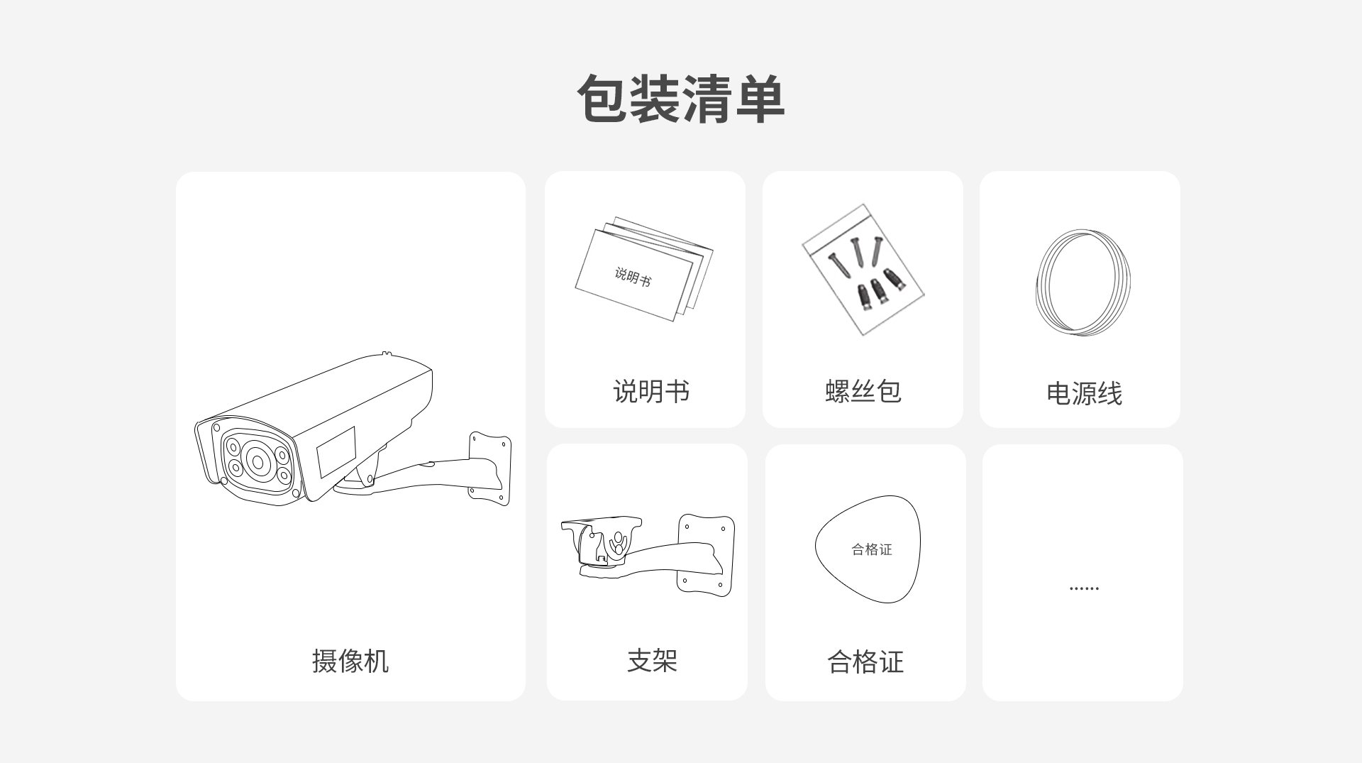 包装清单 | 摄像机,支架、螺丝包,警示贴,内六角扳手,螺丝刀,说明书 |