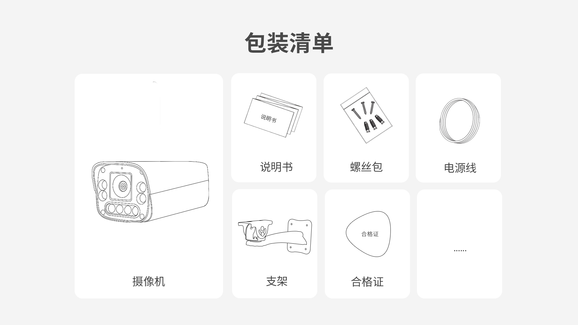 包装清单 | 摄像机,支架、螺丝包,警示贴,内六角扳手,螺丝刀,说明书 |