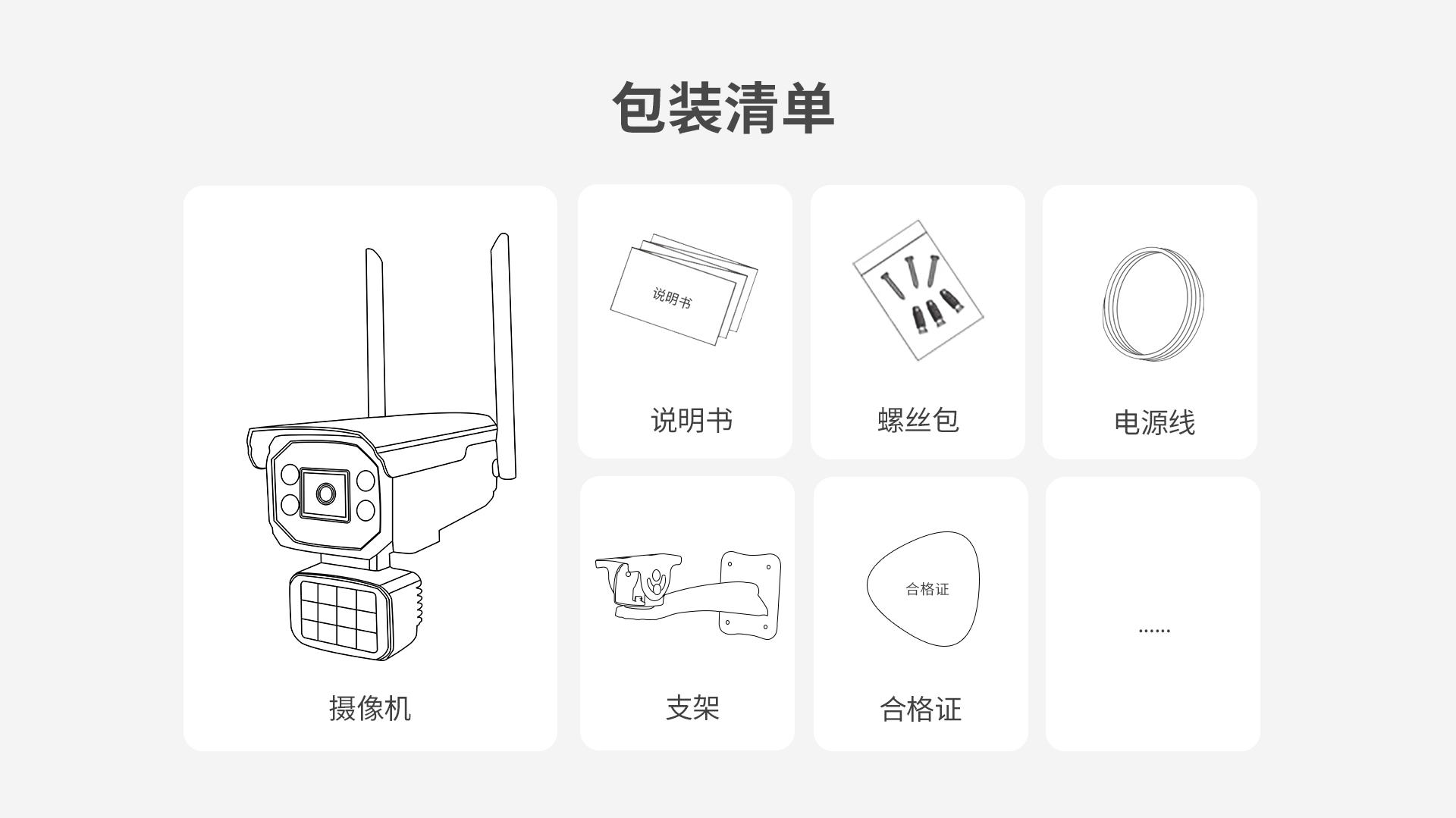 包装清单 | 摄像机,支架、螺丝包,警示贴,内六角扳手,螺丝刀,说明书 |