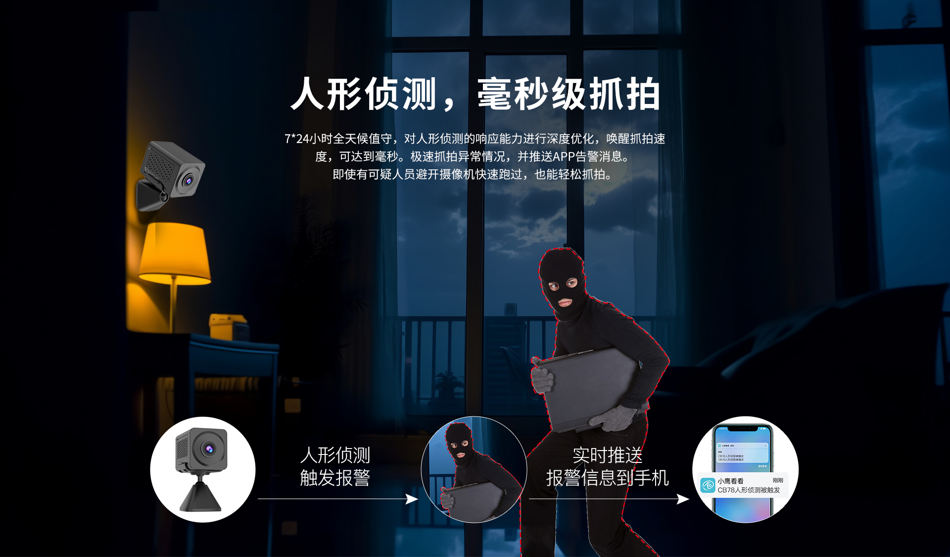 报警 | 报警检测 | 支持移动侦测,人形侦测,人形框定,人形追踪,警笛报警音,区域侦测 |