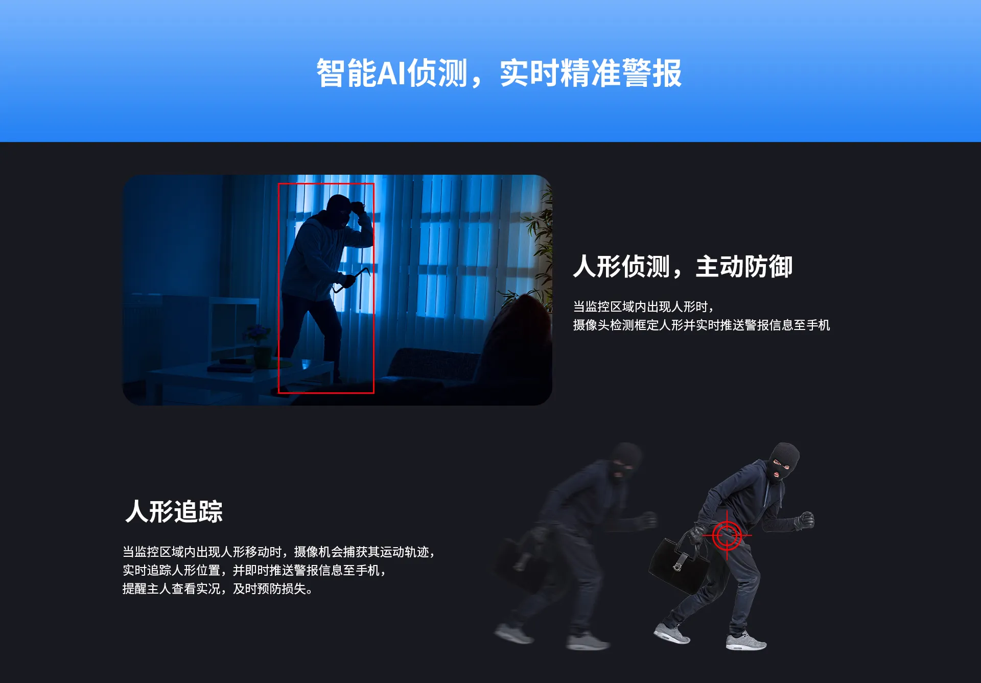 报警 | 报警检测 | 支持移动侦测,人形侦测,人形框定,区域侦测,人形追踪 |