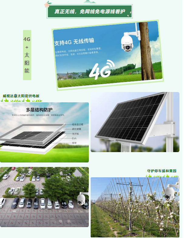 农场果园防偷盗、照看大型工地安全,百亩渔塘防落水垂钓、守护养殖场的动物们,每一处场所都能被忠实无偏袒地守护,当检测人形实时警报,及时止损。4G供网,太阳能供电,拉线困难的场所尽快安排起来,太阳能板和摄像机安装简单,阴雨天也有电,靠谱!