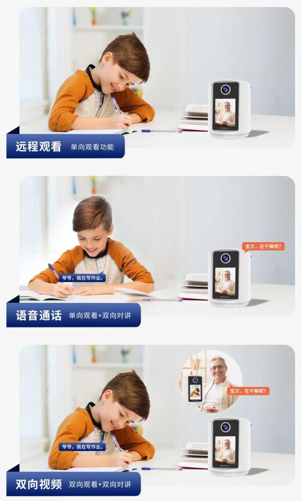 首先是双向视频通话摄像机CV331S,它具备双向视频通话对讲功能。无论你身在何处,千里之外也可以与母亲进行视频通话交流,母亲或孩子也可以轻拨摄像机的呼叫按扭主动呼叫用户,通过双向对讲功能实时交流心情、分享生活点滴。这种陪伴感和沟通方式无疑会让远离家乡的亲人倍感温暖。