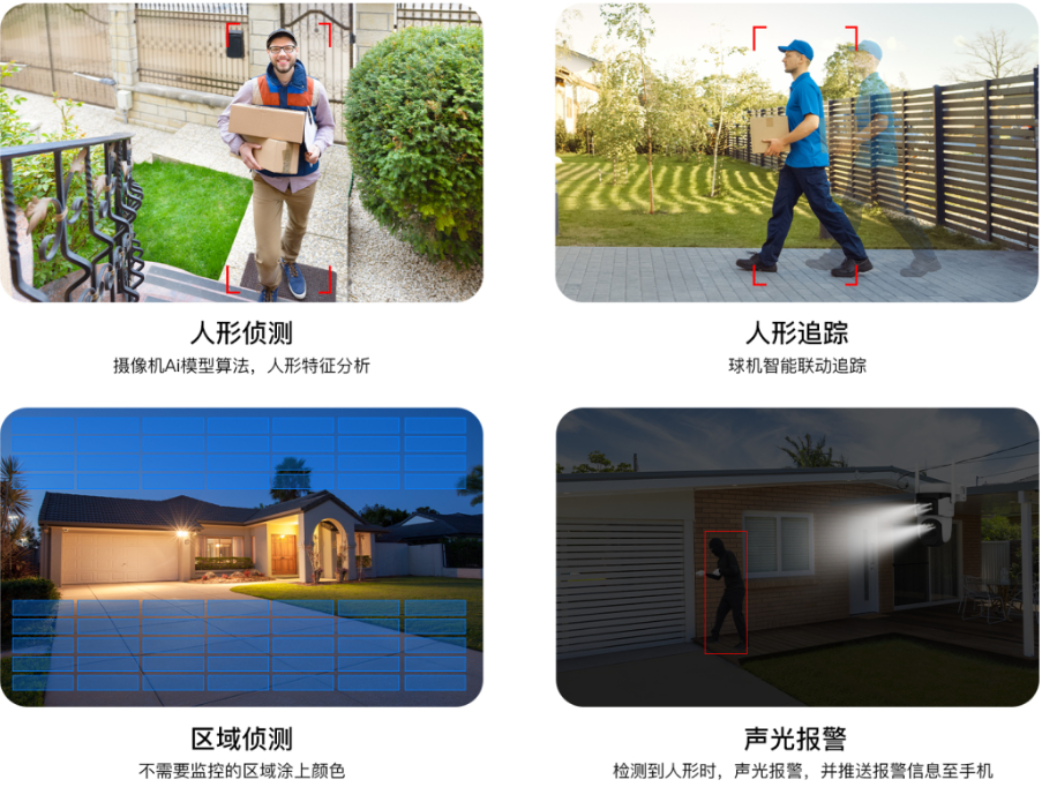 智能侦测体系:全系列标配AI人形识别算法,减少落叶、飞鸟等环境干扰产生的误报。