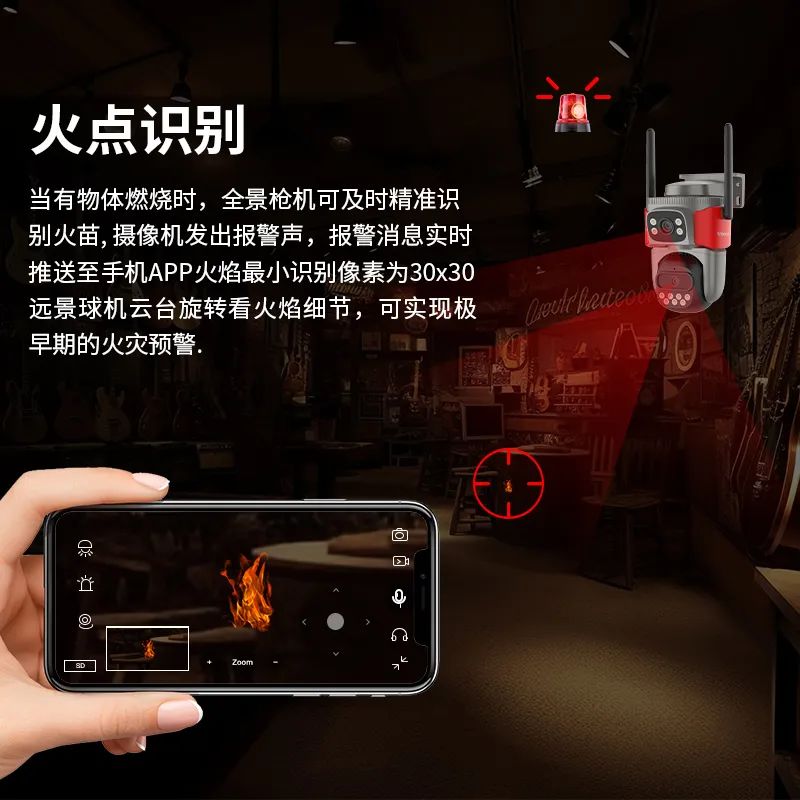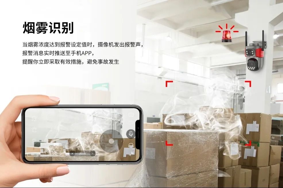 春季天干物燥,火险隐患陡增。烟火警报摄像机FG621DR/AF621DR通过AI算法精准识别火苗、烟雾,第一时间触发闪光+语音+推送三重警报。