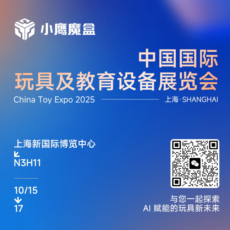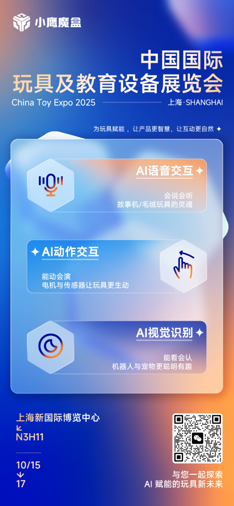 小鹰视界(展位号:N3-H11)将携 小鹰魔盒 首次亮相CTE,以 模块化AI交互技术 为毛绒玩具、故事机、教育玩具等产品提供快速升级方案,帮助客户缩短研发周期、降低技术门槛,加快新品上市。