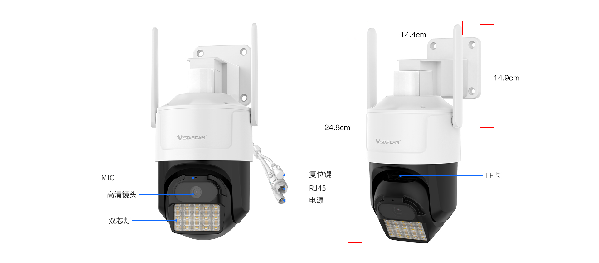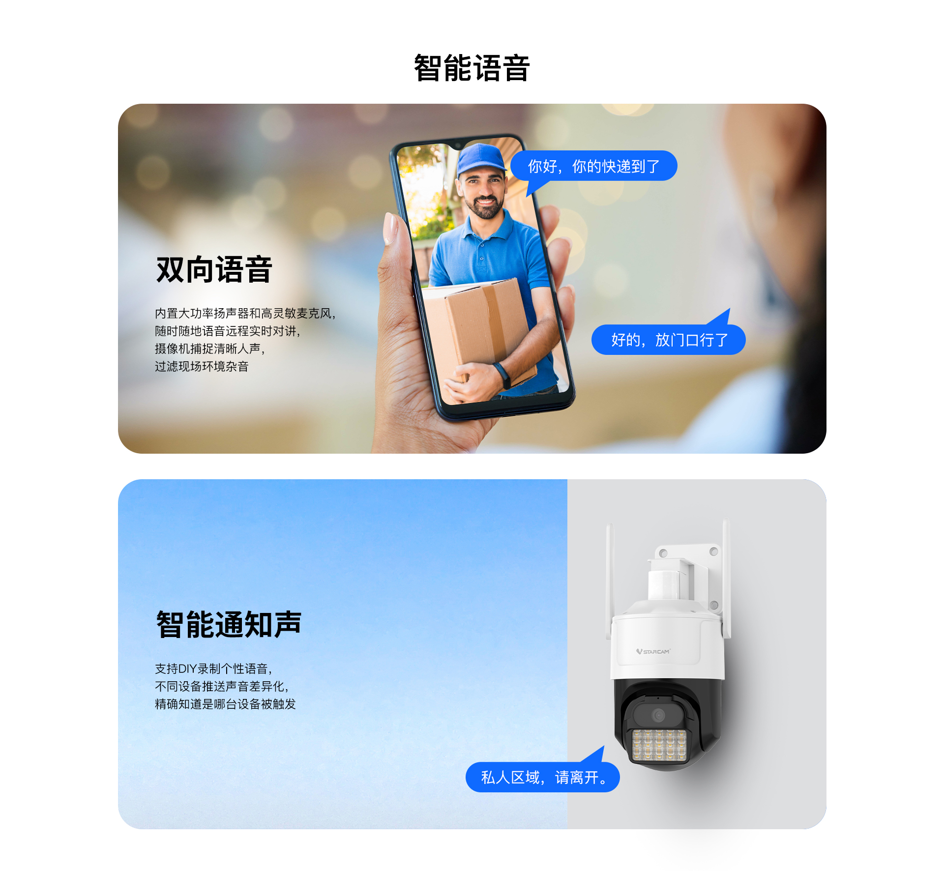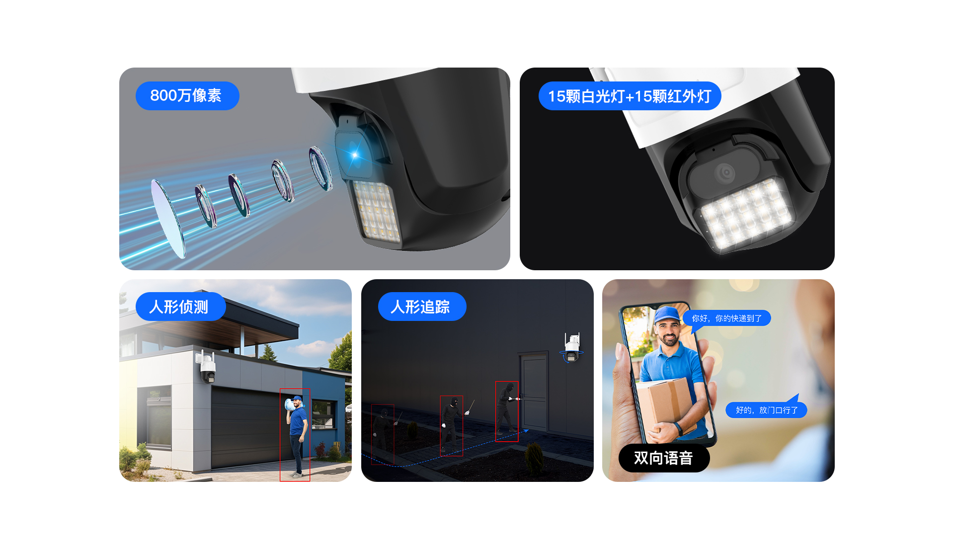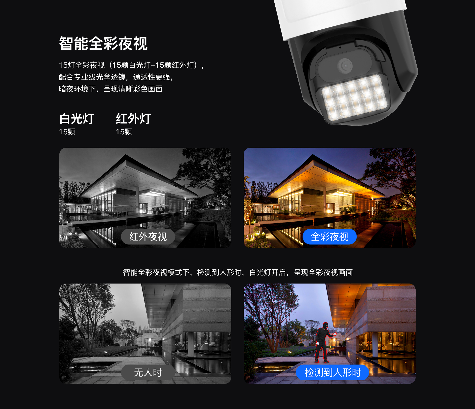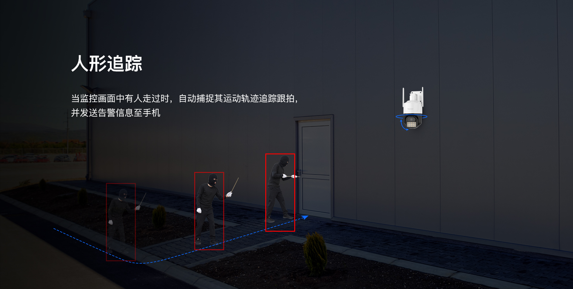 报警 | 报警检测 | 支持移动侦测,人形侦测,人形框定,人形追踪,警笛报警音,区域侦测 |