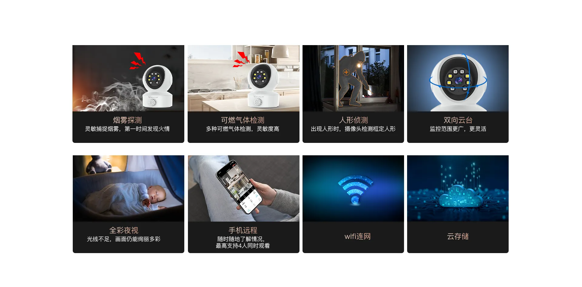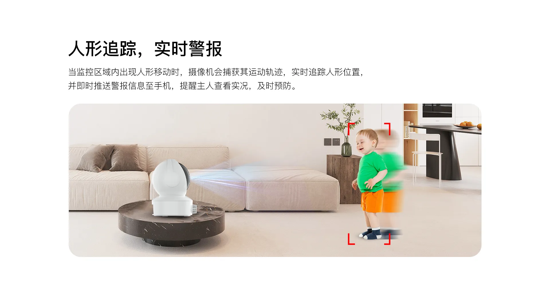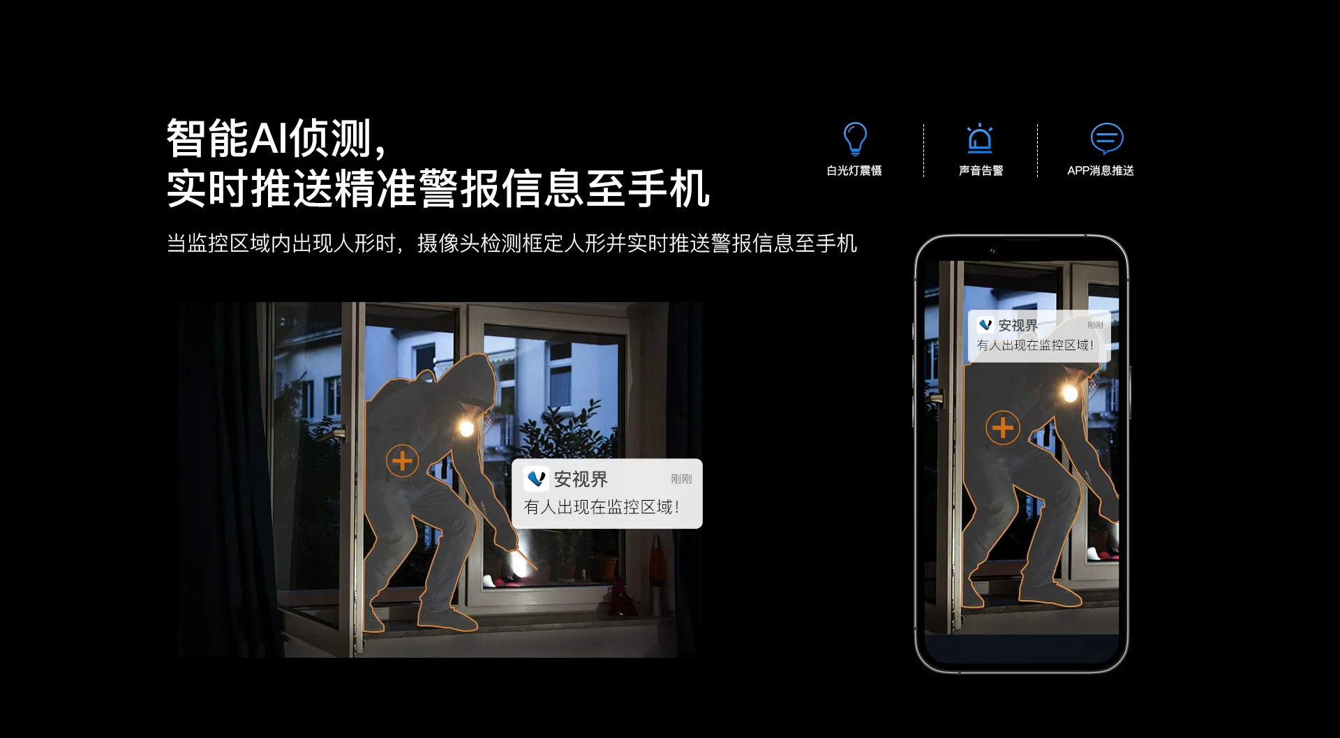 报警 | 报警检测 | 支持烟雾探测、可燃气检测、移动侦测,人形侦测,人形框定,区域侦测,人形追踪 |