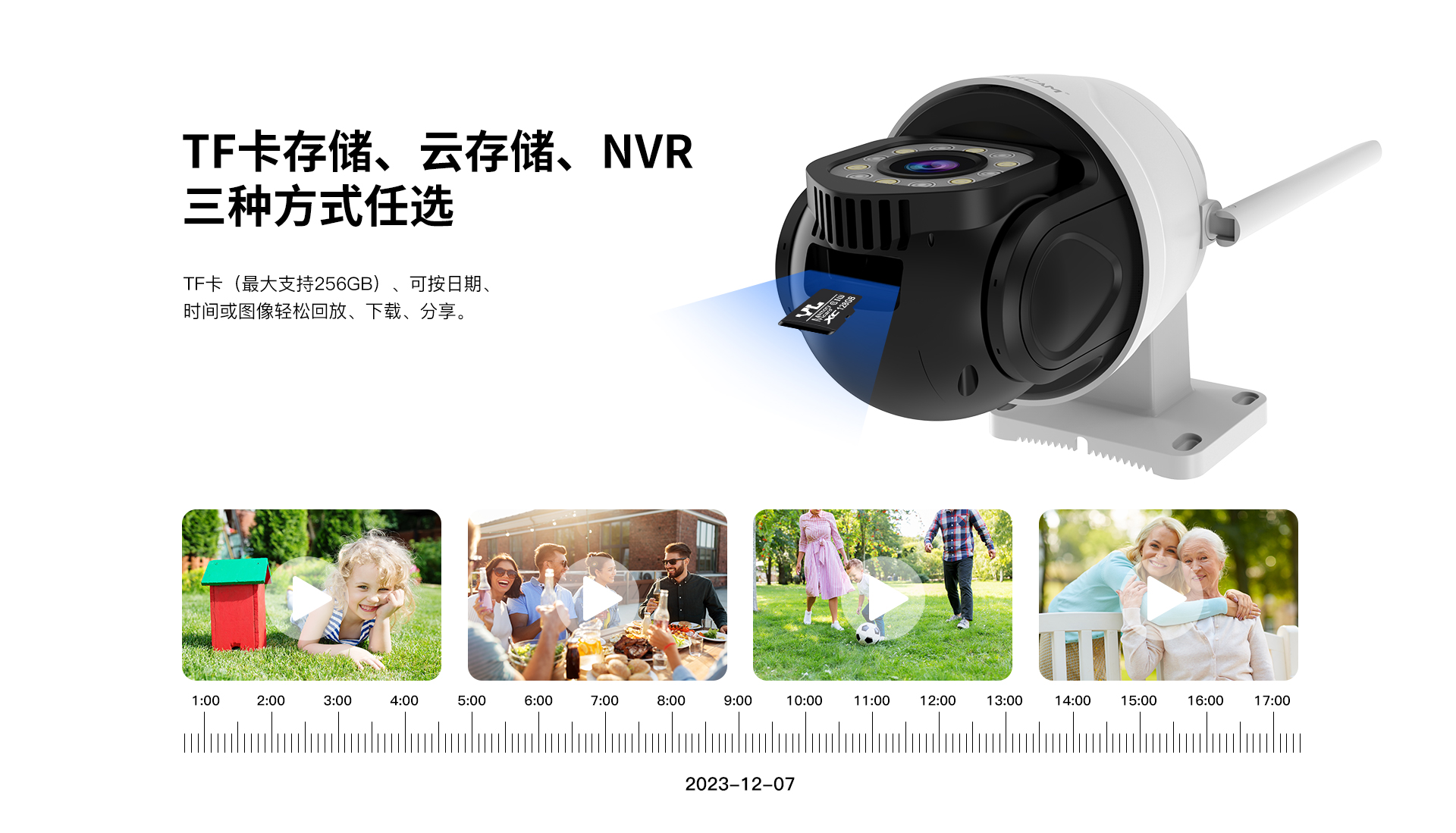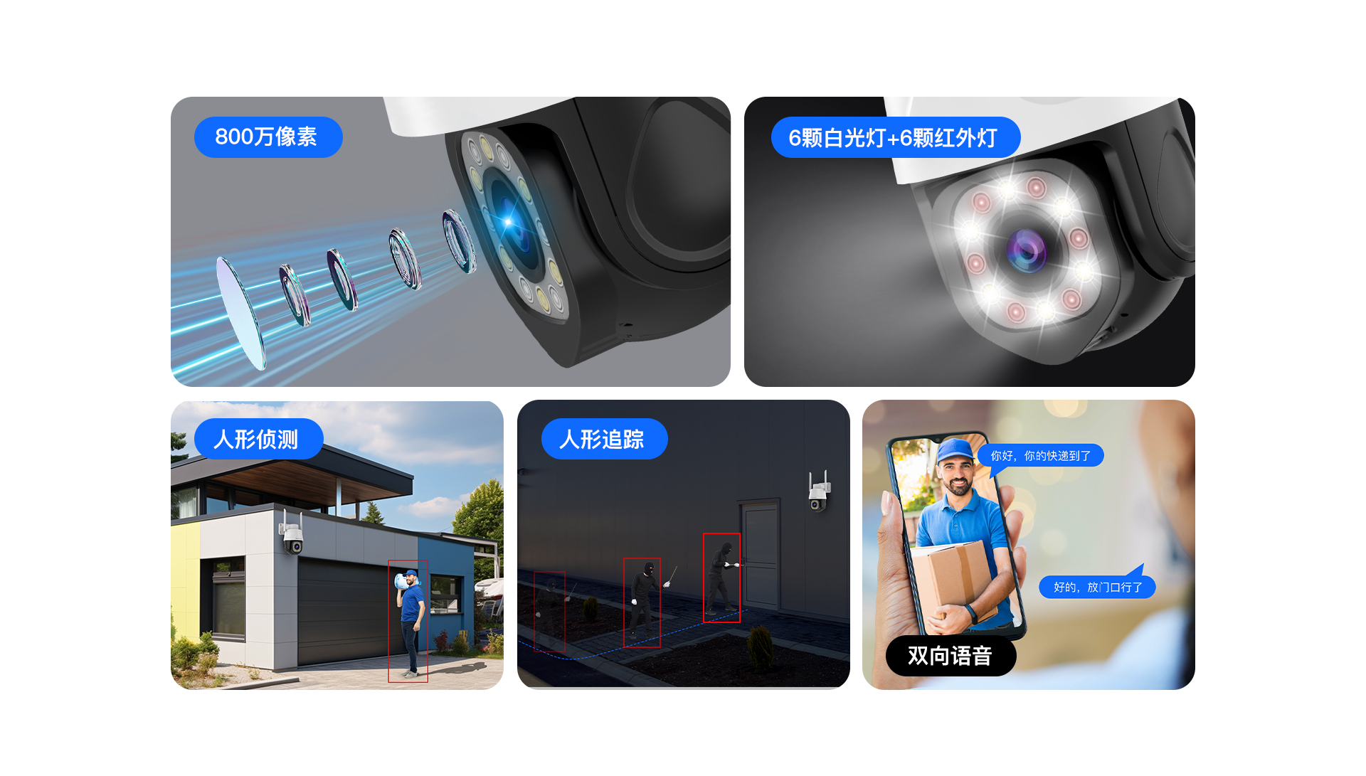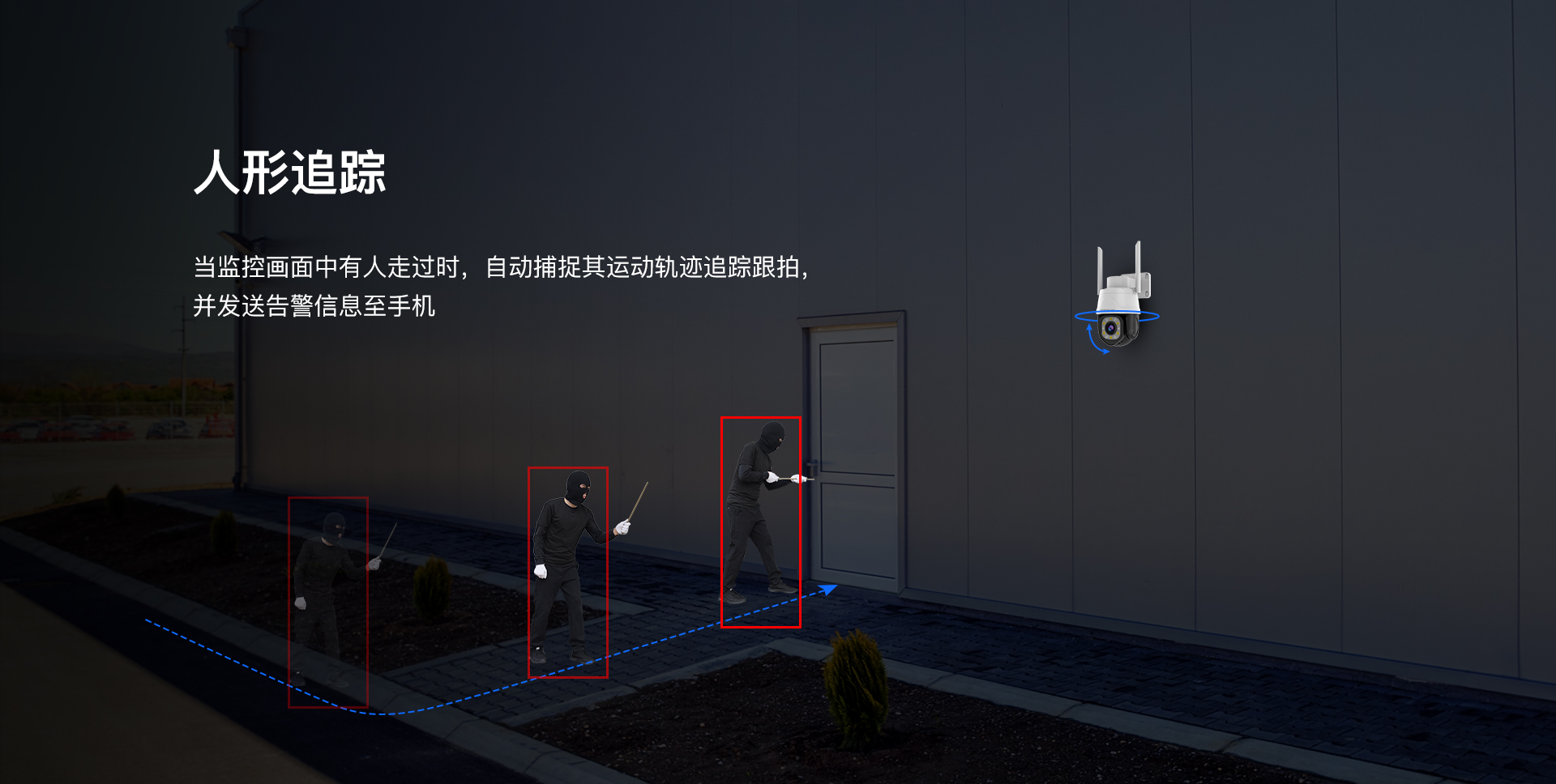 报警 | 报警检测 | 支持移动侦测,人形侦测,人形框定,人形追踪,警笛报警音,区域侦测 |