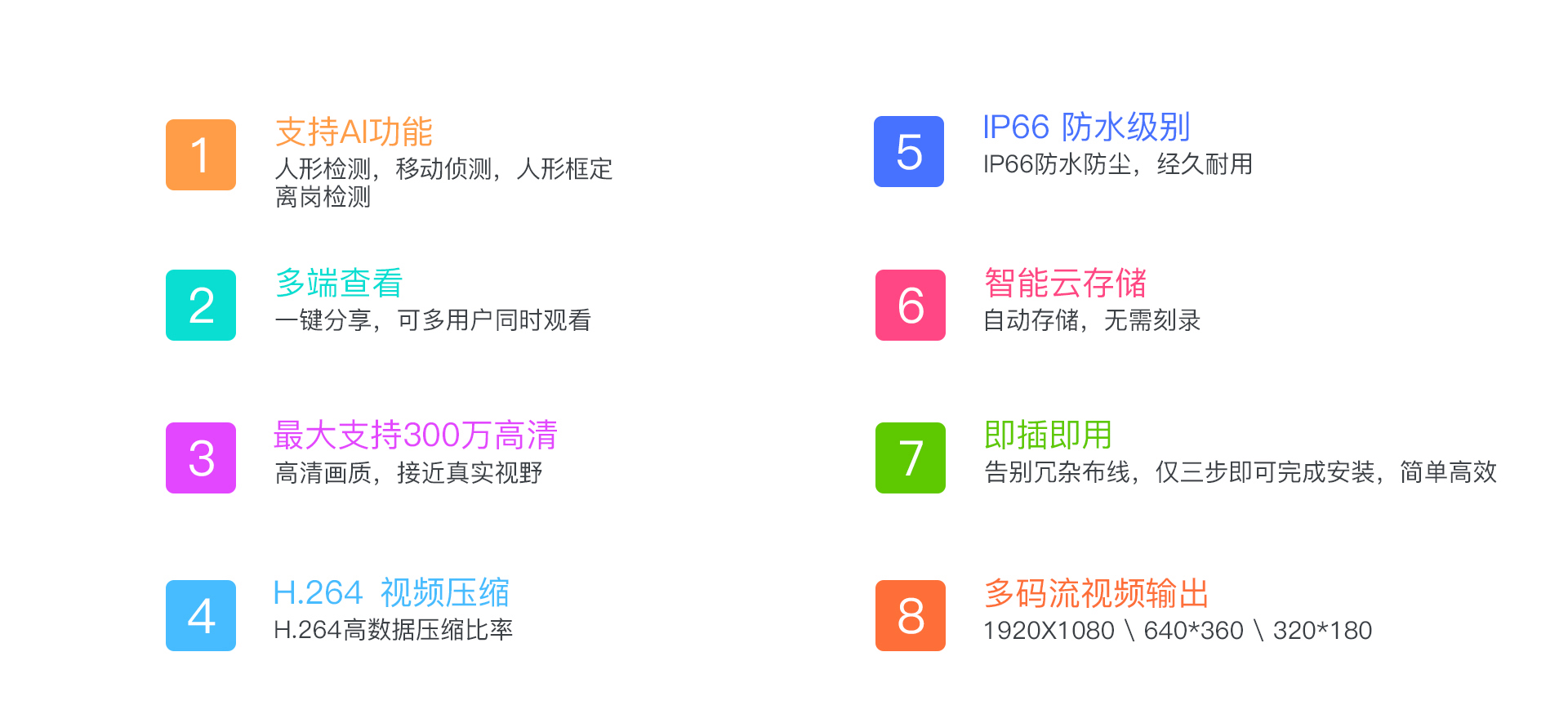 | 报警 | 报警检测 | 支持移动侦测,人形侦测,人形框定,区域侦测 |