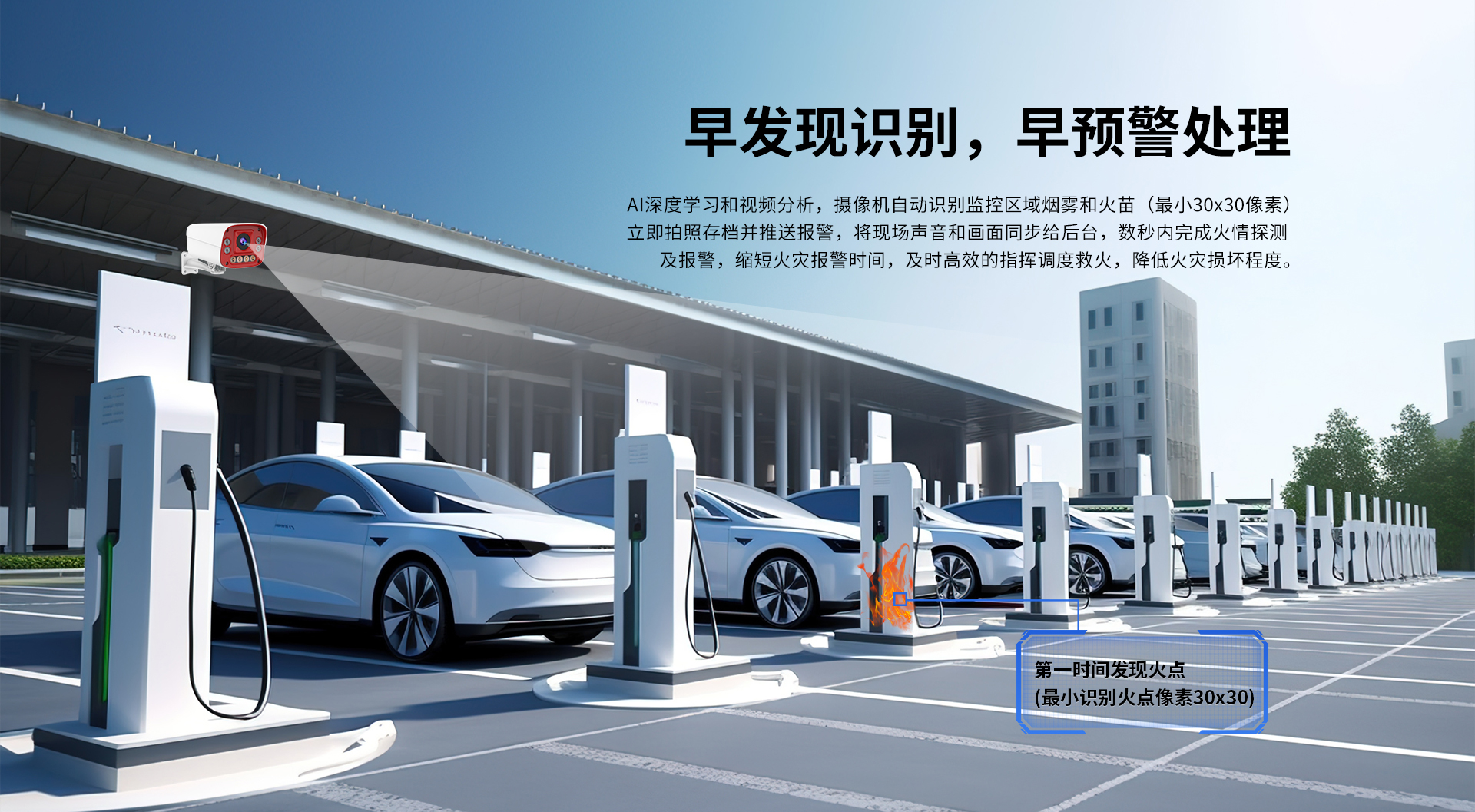 | AI | 烟火检测 | 明火及烟雾检测框定,直接定位火点位置; 火焰最小像素:30X30像素,持续时间3秒以上; 可识别火焰颜色:红外、橙色、黄色; 可识别烟雾颜色:灰白色,灰黑色; 建议安装高度:3米;检测率:90% |