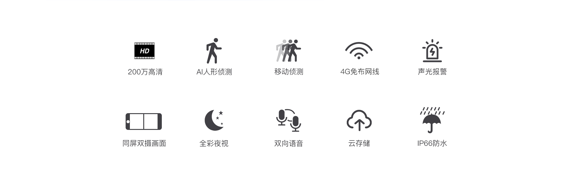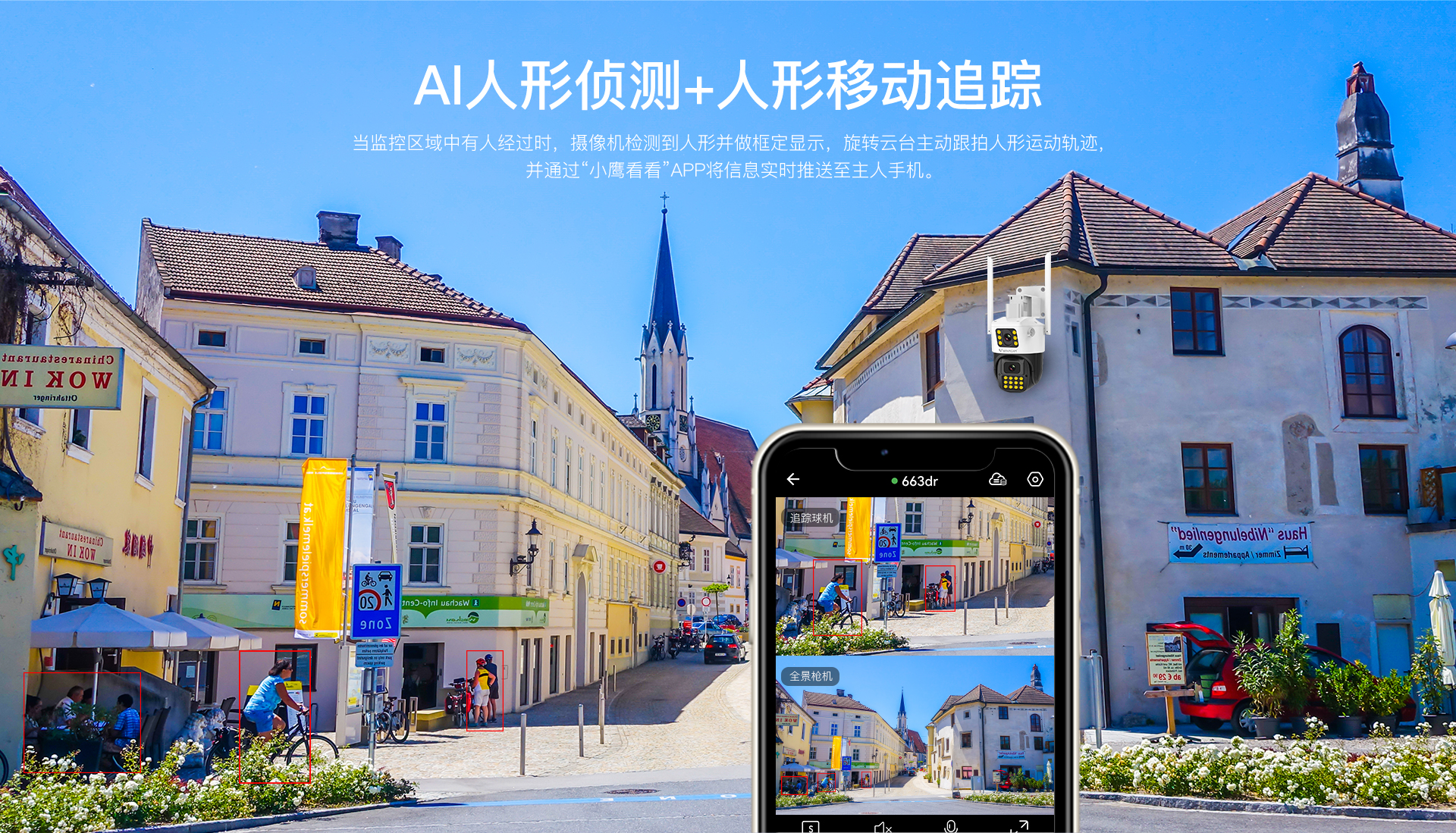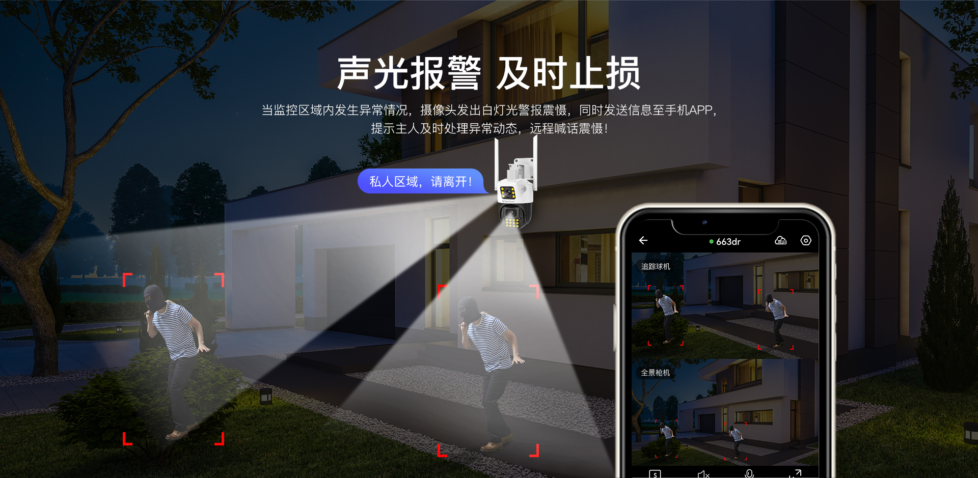 支持移动侦测,人形侦测,人形追踪,报警语音提示和爆闪、照射功能,白光灯定时启动关闭功能。 |