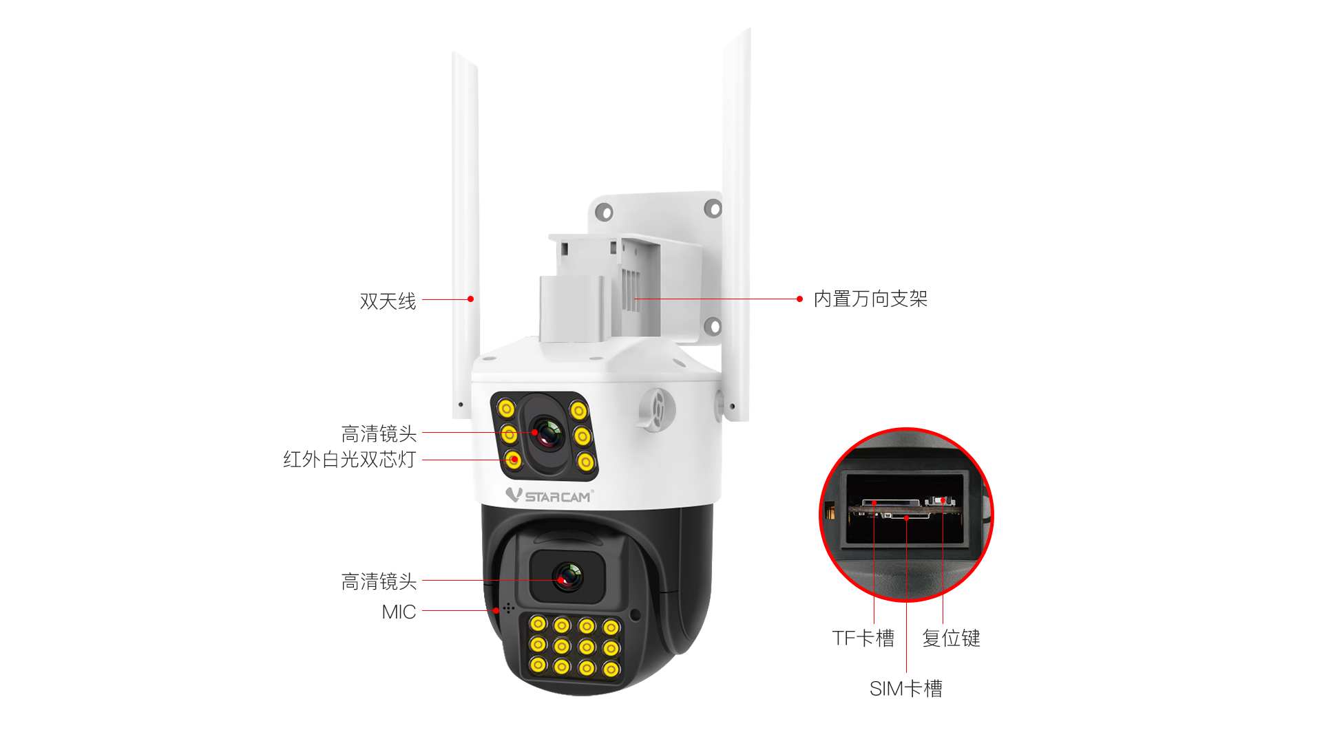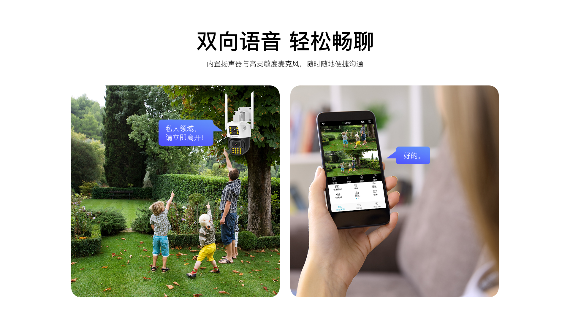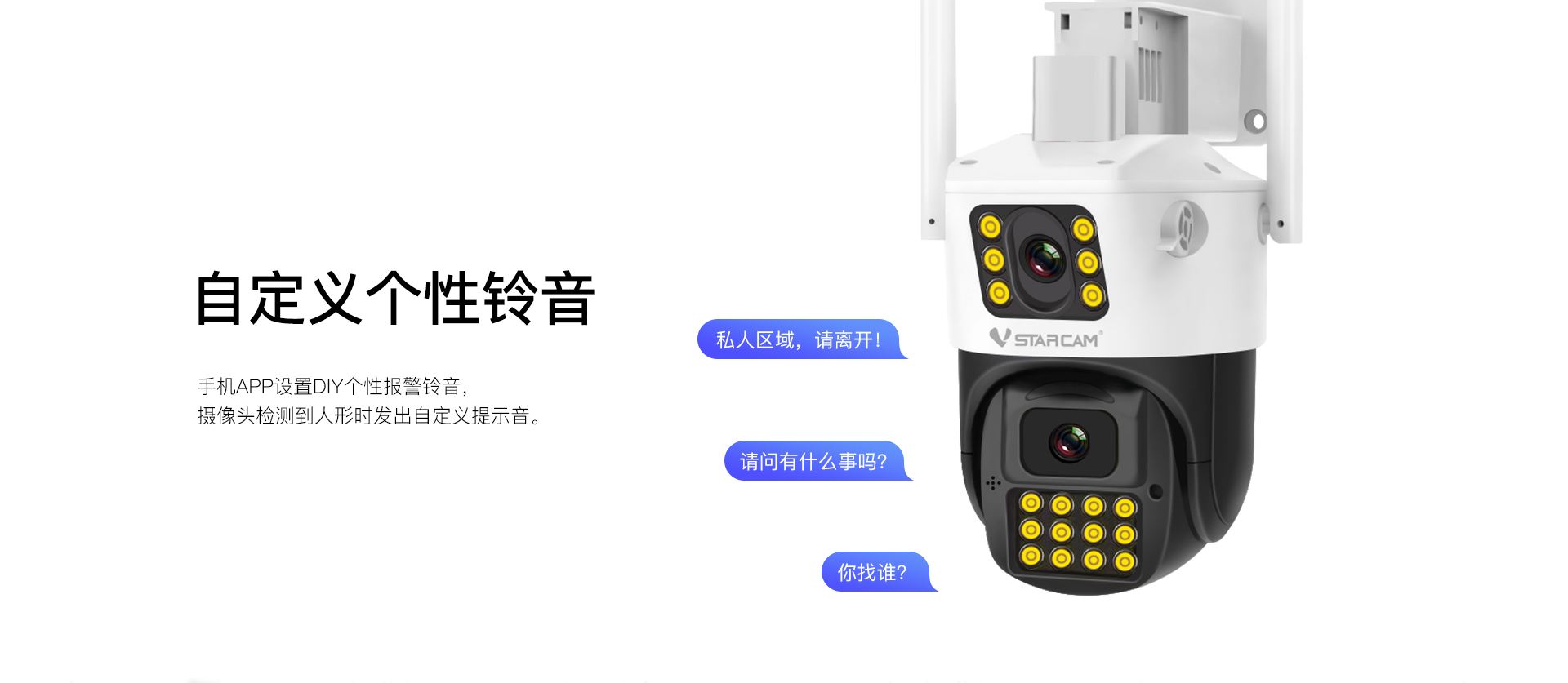 支持移动侦测,人形侦测,人形追踪,报警语音提示和爆闪、照射功能,白光灯定时启动关闭功能。 |