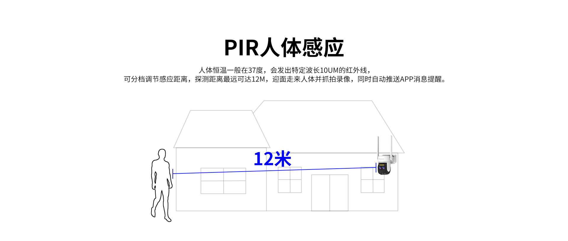 PIR人体侦测/人形侦测,可分档调节距离,探测距离最远可达15M |