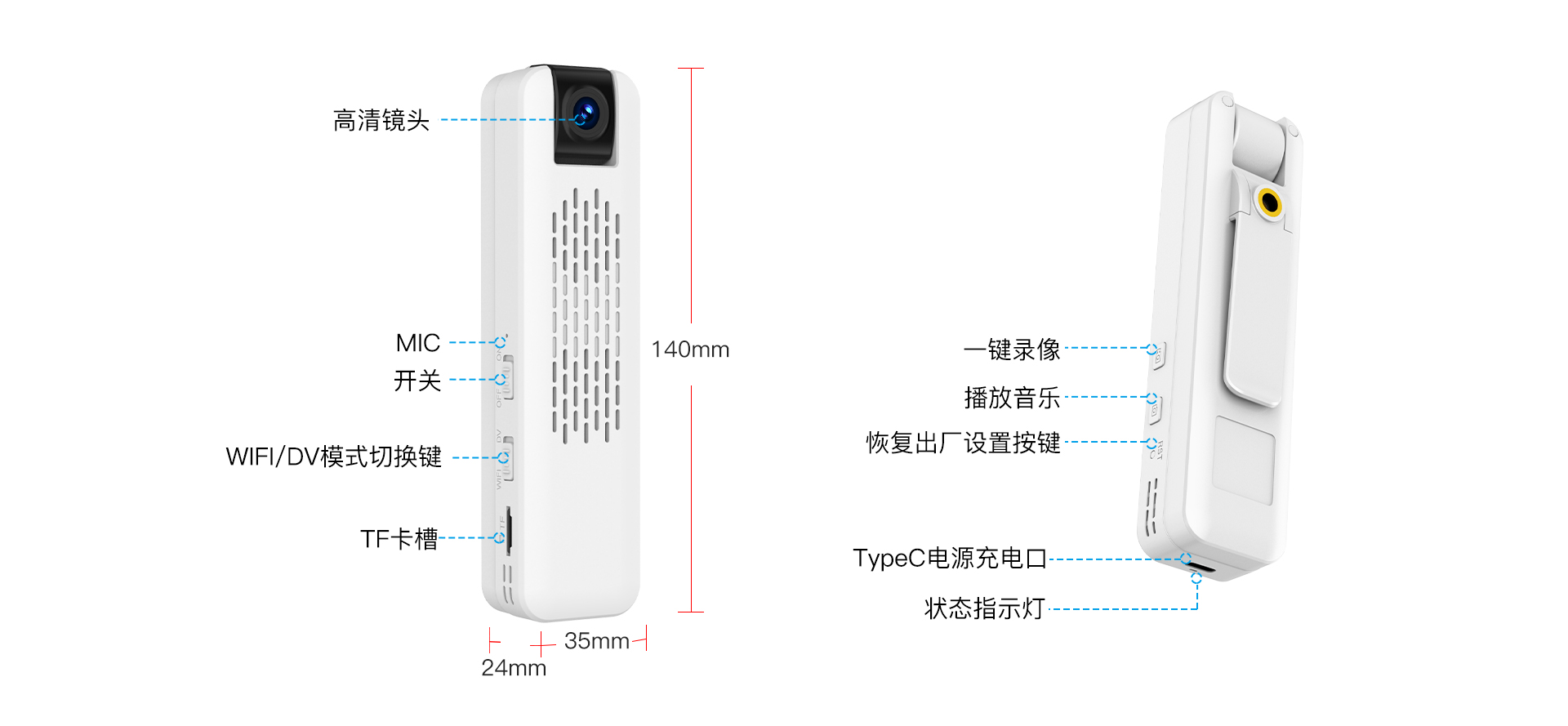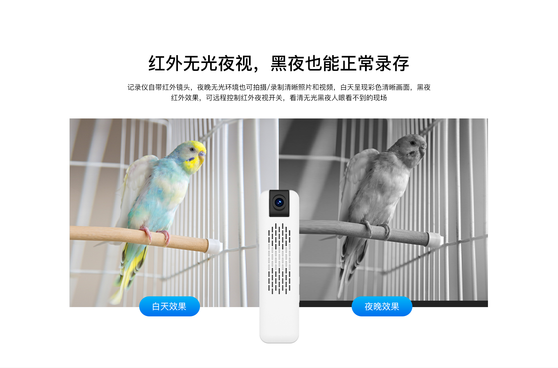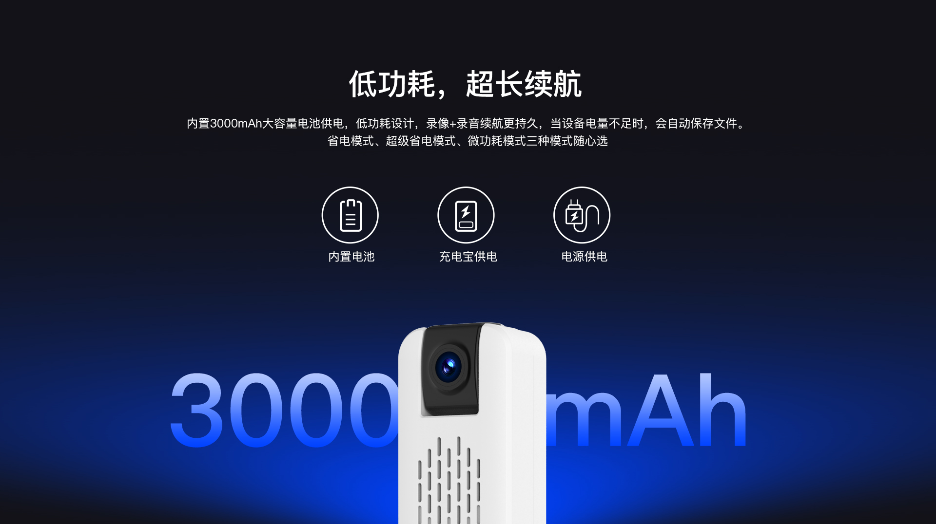 ✮ 内置3000mAh电池供电,持久续航,录音、录像二合一,声音画面同步 |