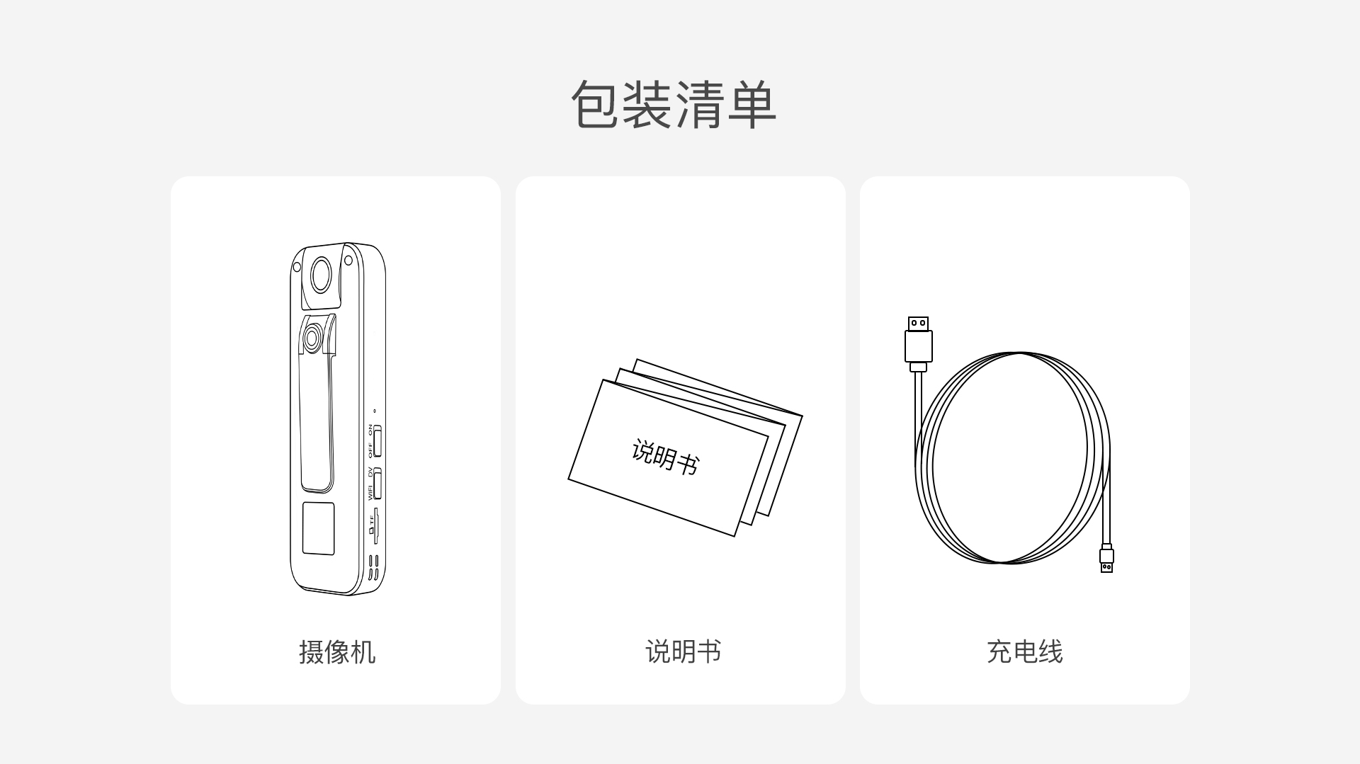 主机*1,说明书*1,充电线*1,扎带*2,魔术贴*2 |