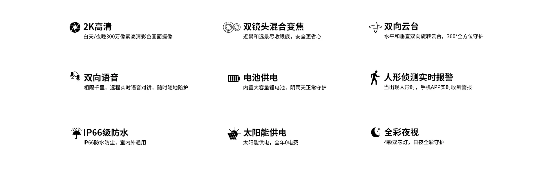 | 包装清单 | 主机*1,螺丝包,MICRO USB*1,说明书*1,(太阳能板*1,太阳能板支架*1 选配) | |