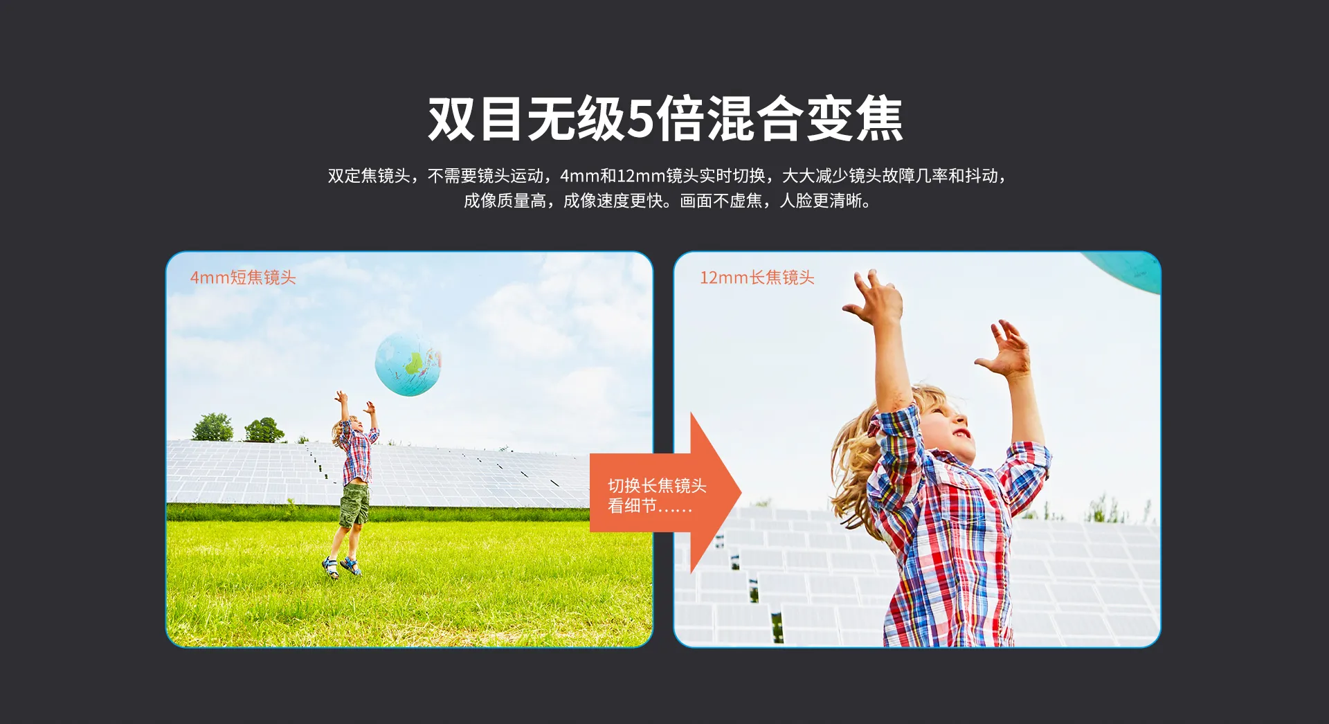 | 镜头 | 4mm+12mm 长焦镜头+短焦镜头组合 IRCUT一体式 | |