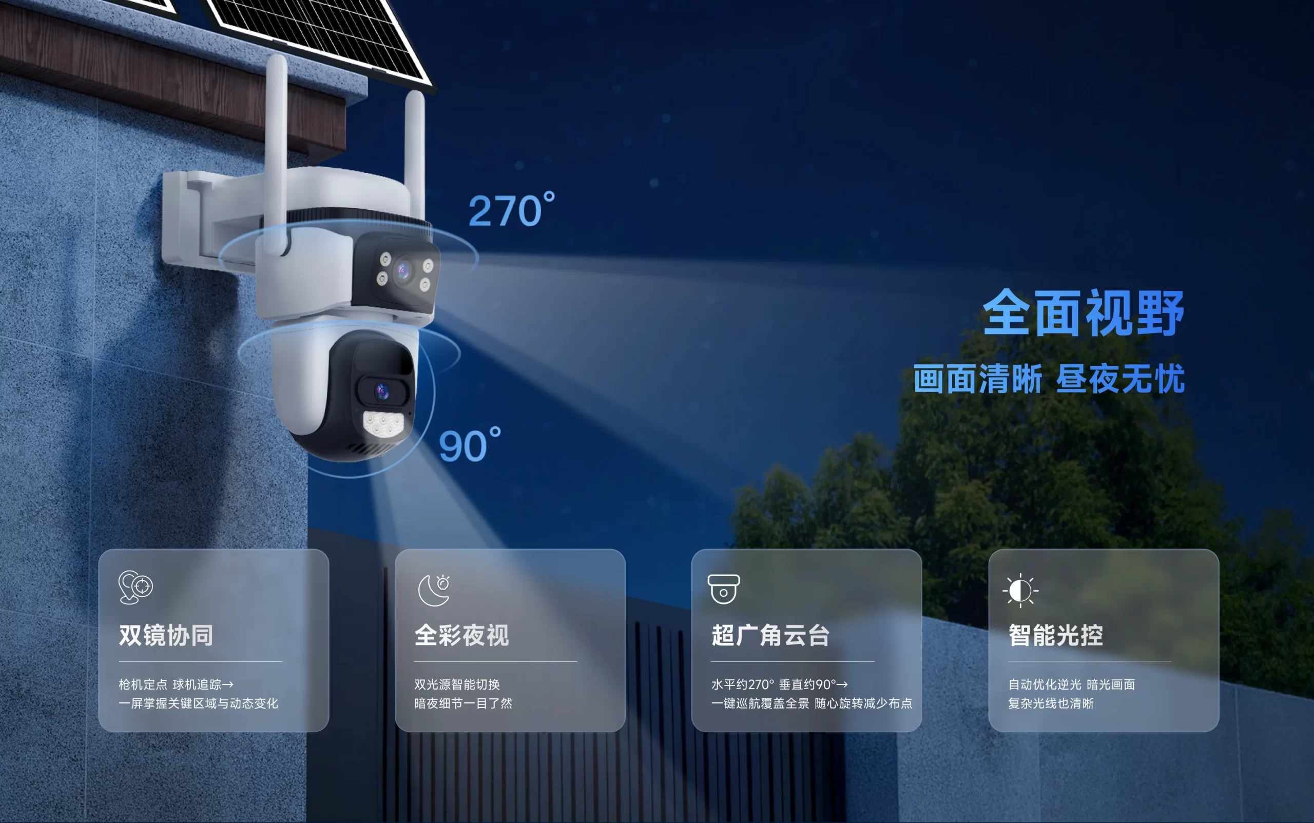 | 超大广角监控,三向云台,水平270°,垂直90°,灵活旋转,360度无遮挡 |