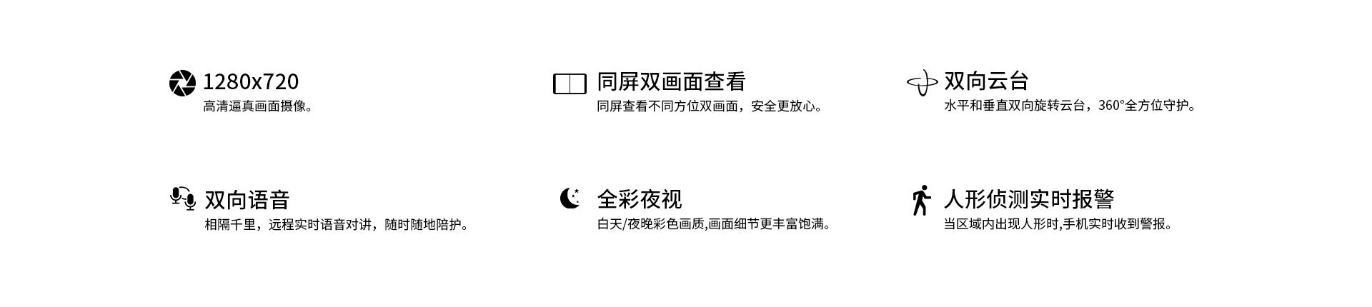 报警 | 报警检测 | 支持移动侦测,人形侦测,人形框定,区域侦测,人形追踪 | 报警 | 报警检测 | 支持移动侦测,人形侦测,人形框定,区域侦测,人形追踪 | |