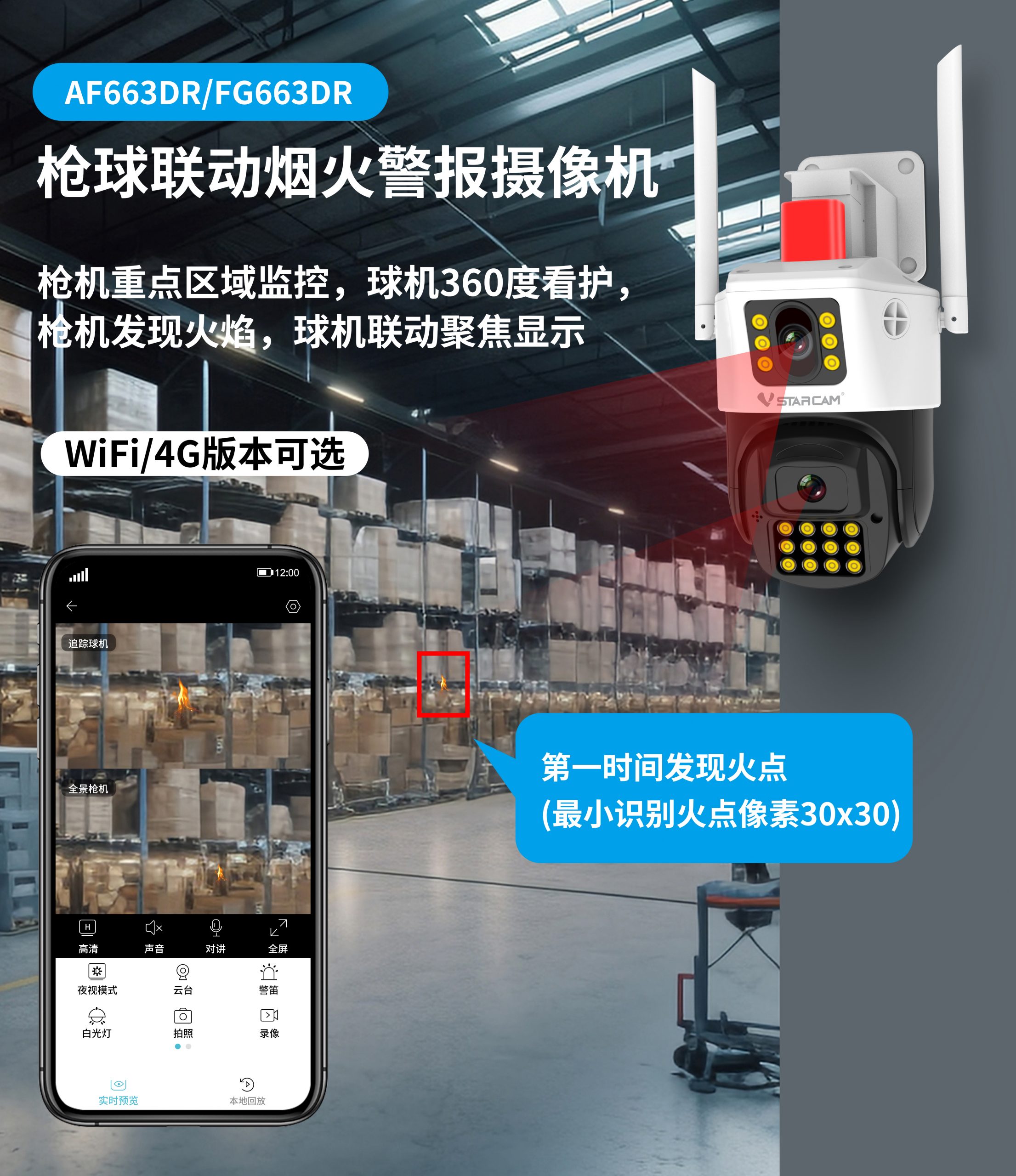 其中,华体会体育双镜头烟火警报摄像机通过AI算法+烟火检测双警报,可以快速识别明火和烟雾并实时双警报,极大地提高了摄像机的使用效率。