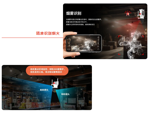 烟火识别摄像机具有安防摄像机产品所有功能。人形侦测,人形追踪,区域检测,移动侦测等,在烟火监测的同时,对场所内的安全防护等实现同步监控。保护人们生命和财产安全。