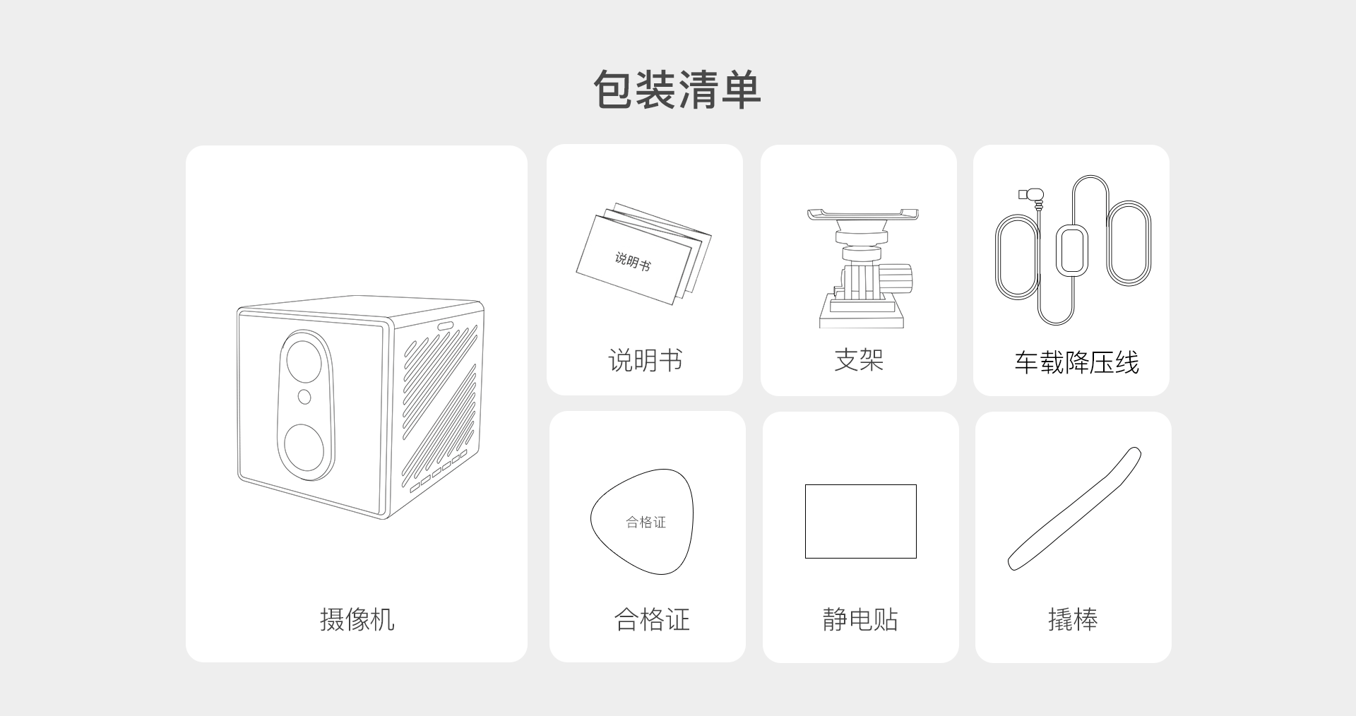 主机*1,支架*1,静电贴*1,说明书*1,SIM卡*1,内卡*1,汽车降压线*1,安装工具*1,车载点烟器电源*1(选配),3米USB充电线*1(选配) |