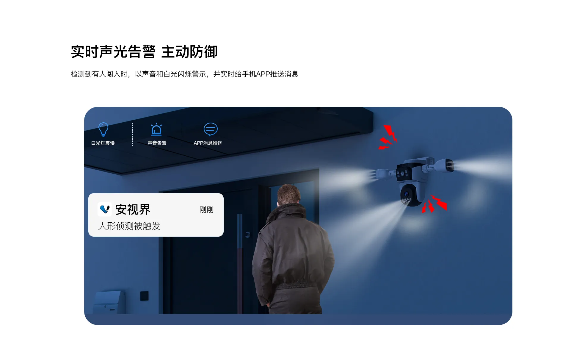| 报警 | 报警检测 | 支持移动侦测,人形侦测,人形框定,区域侦测,警笛声报警 |
