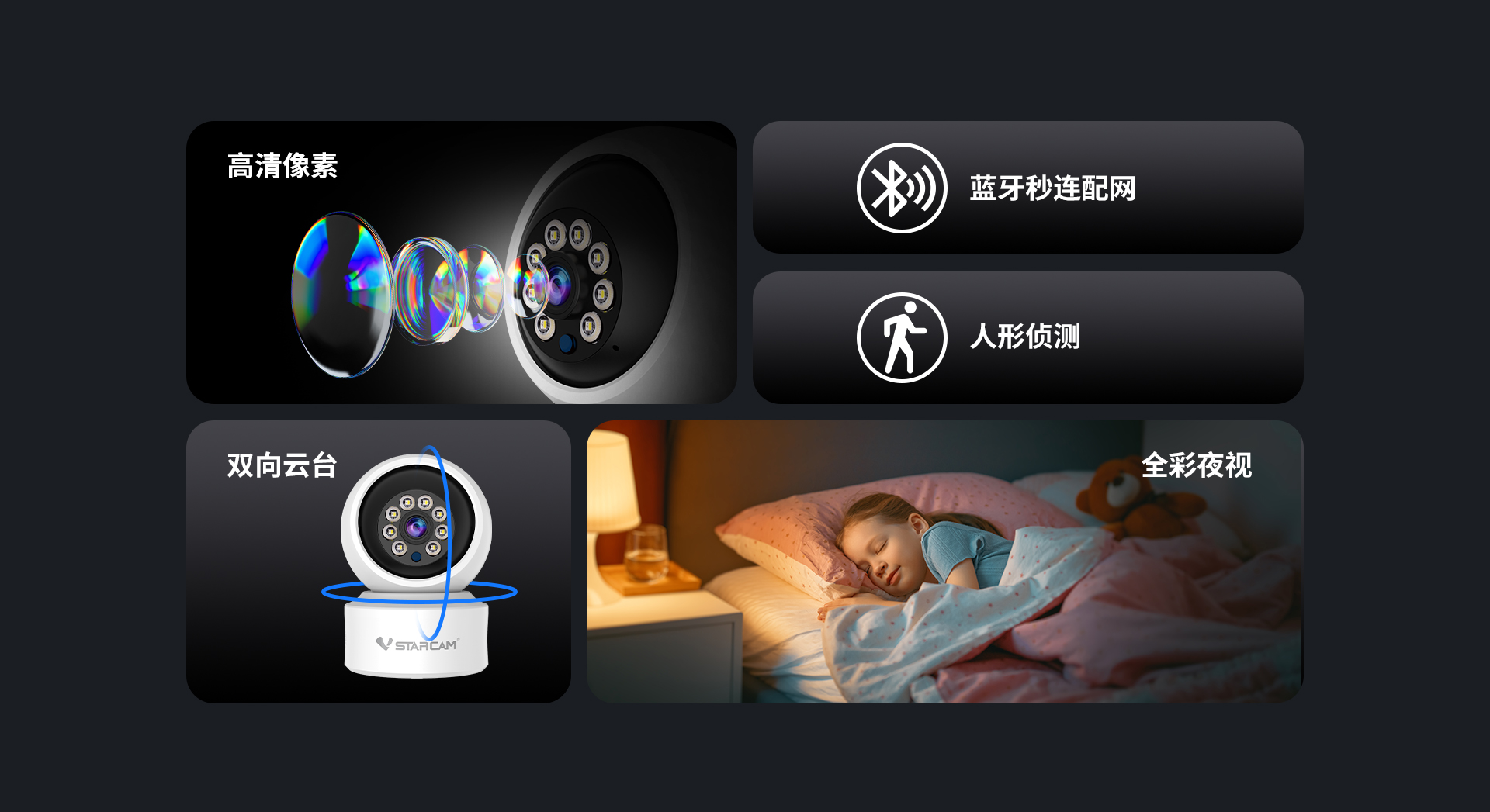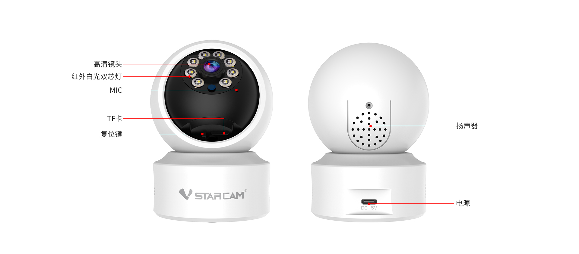 支持移动侦测,人形侦测,人形追踪,报警语音提示和爆闪、照射功能,白光灯定时启动关闭功 能。 |
