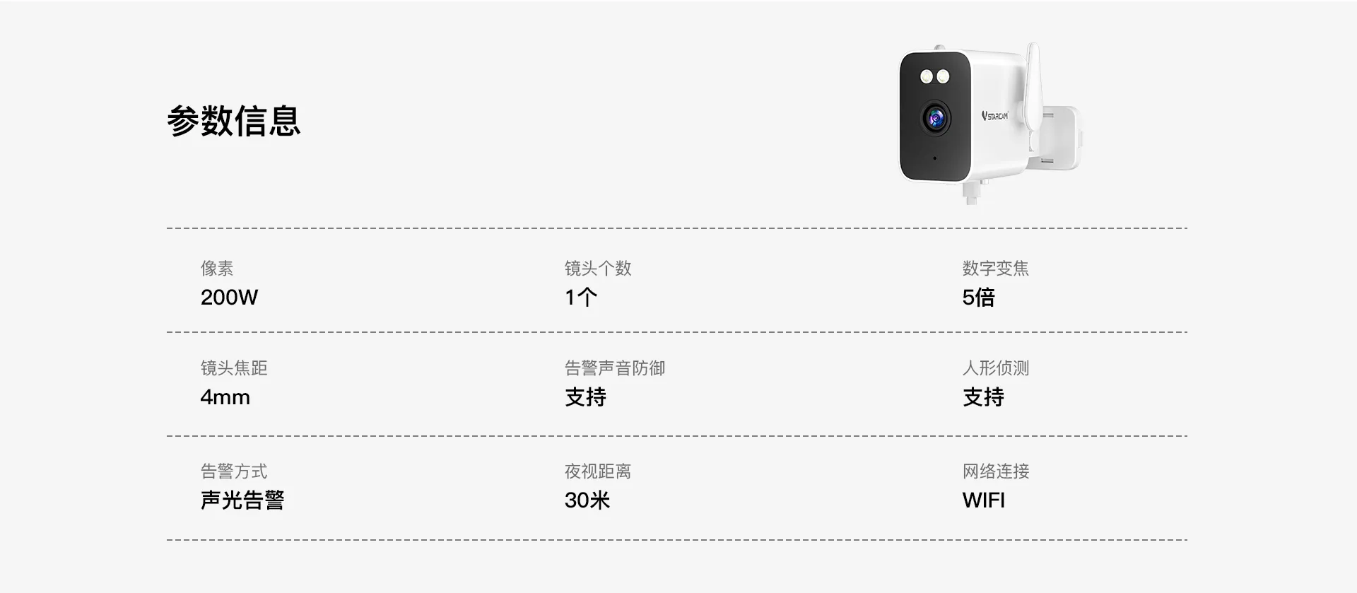 | 报警 | 报警检测 | 支持移动侦测,人形侦测,人形框定,区域侦测,人形追踪 |