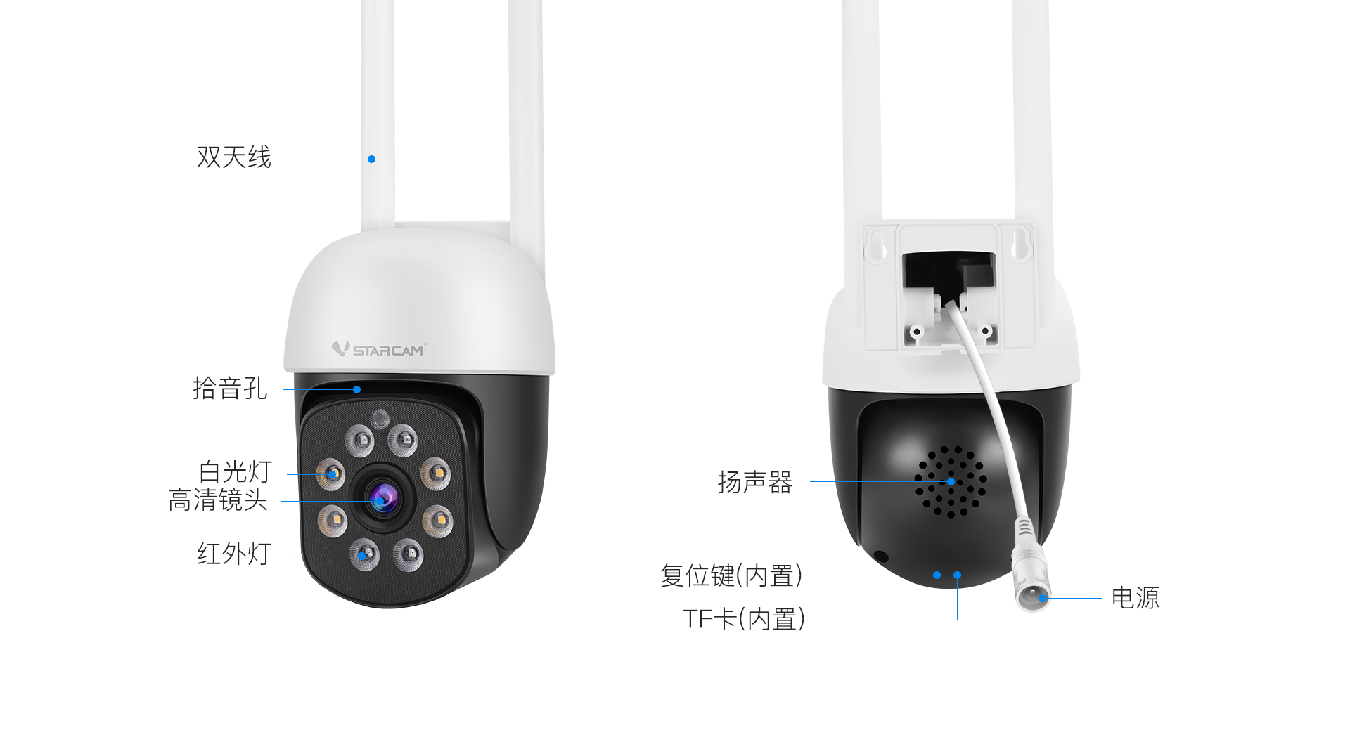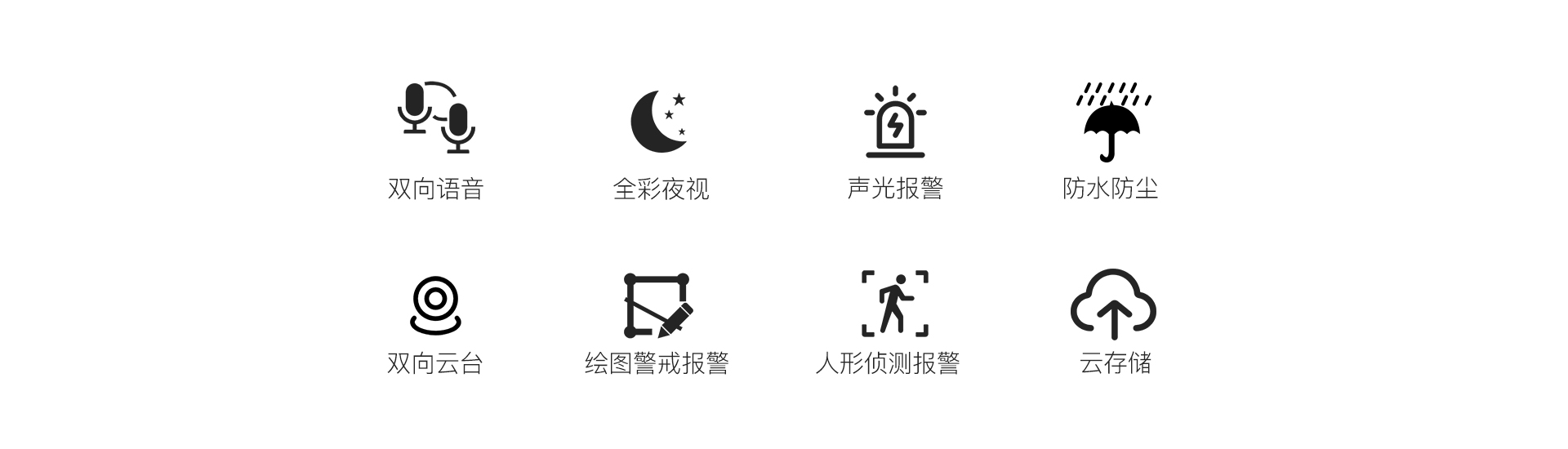 支持移动侦测,人形侦测,人形追踪,报警语音提示和爆闪、照射功能,白光灯定时启动关闭功能。 |